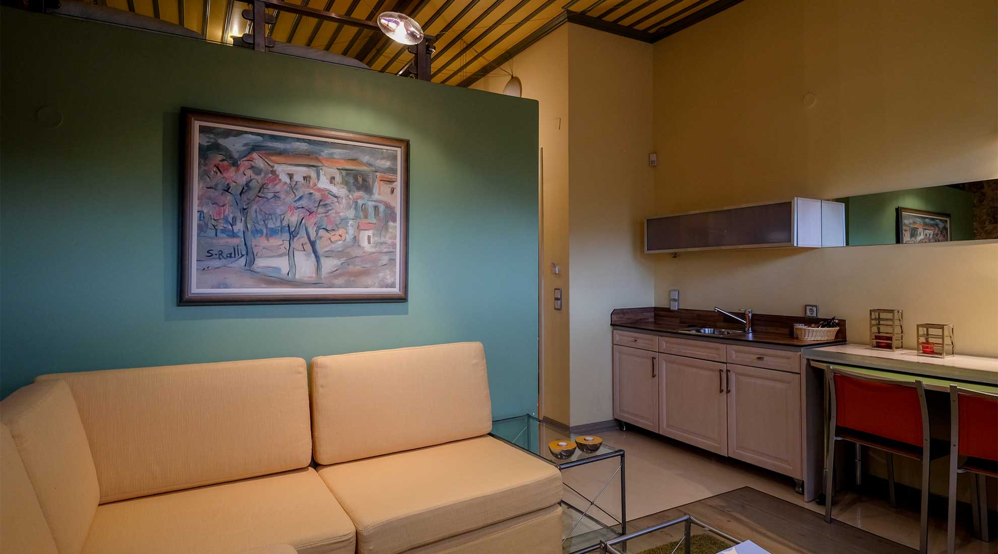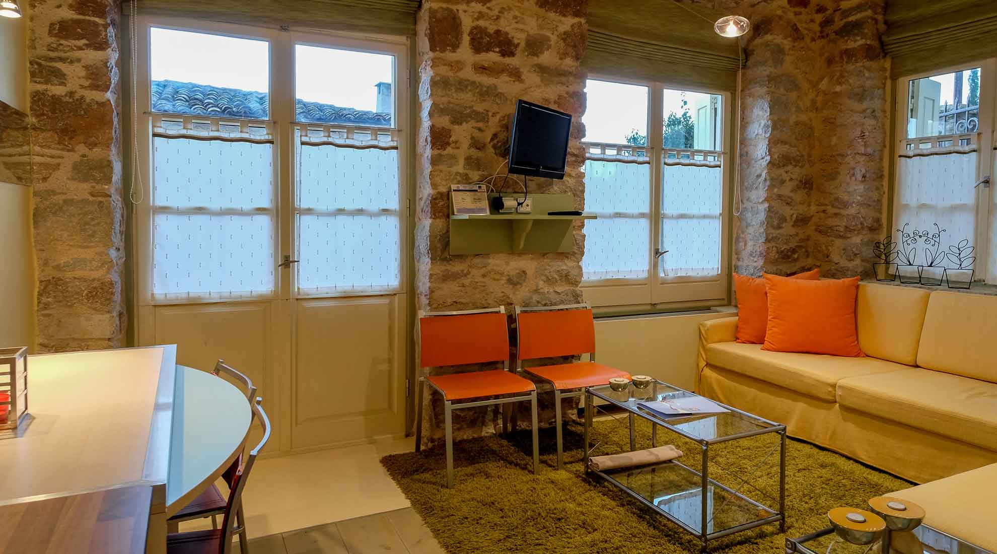 Δύο διαμερίσματα αυτού του τύπου, βρίσκονται στο ισόγειο του αρχοντικού, που υπήρξε ένας ιδιαίτερα ψηλοτάβανος χώρος. Γι’ αυτό εδώ έχουν δημιουργηθεί από ένα υπέρδιπλο κρεβάτι σε κάθε πατάρι κι από ένα μονό στο χώρο που δημιουργείται κάτω από τις σκάλες των παταριών, ο οποίος έξυπνα φωτίζεται από το κρυστάλλινο κεφαλόσκαλο της κάθε σκάλας. Στα εξαιρετικά ευρύχωρα καθιστικά τους, με τα ψηλά παράθυρα, τα οποία βλέπουν στο χωριό, πλάι στο κουζινάκι, υπάρχει έπιπλο με ανοιγόμενη τραπεζαρία, αλλά και η δυνατότητα να φιλοξενηθεί ένα ακόμα άτομο.