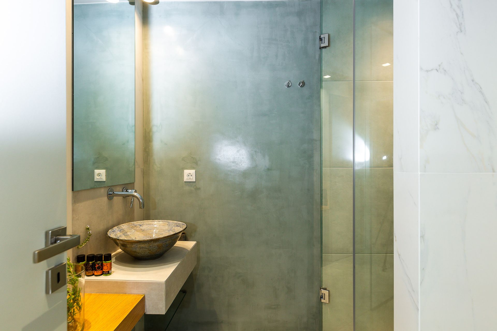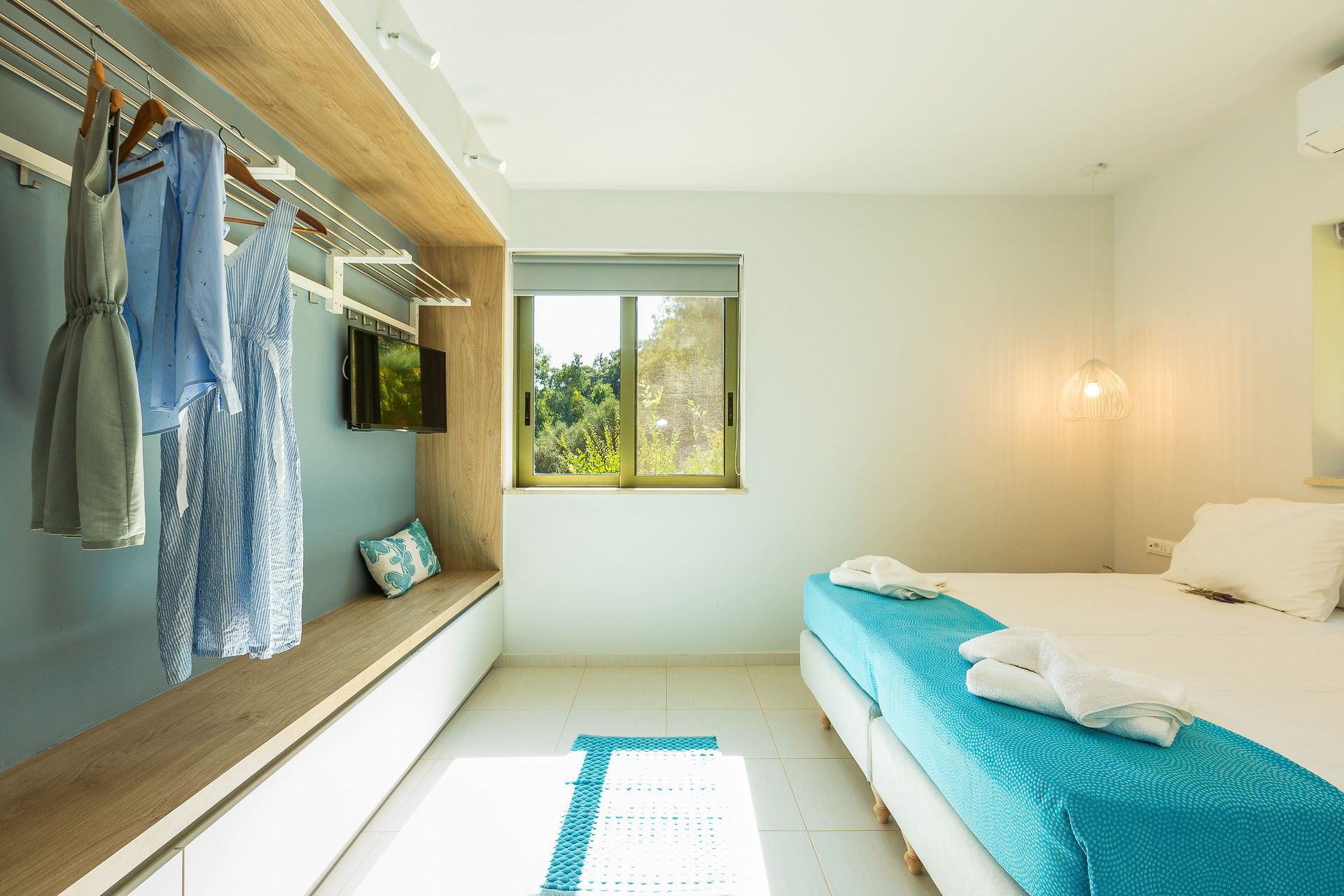 Ακολουθεί το κλιματιζόμενο σαλόνι με τον άνετο καναπέ που μετατρέπεται σε διπλό κρεβάτι. Το σαλόνι μας διαθέτει επίσης εσωτερικό τζάκι και τηλεόραση smart. Όλα συνδυάζονται για μια ζεστή εμπειρία γεμάτη άνεση με ανοιχτή θέα στον ιδιωτικό κήπο.
