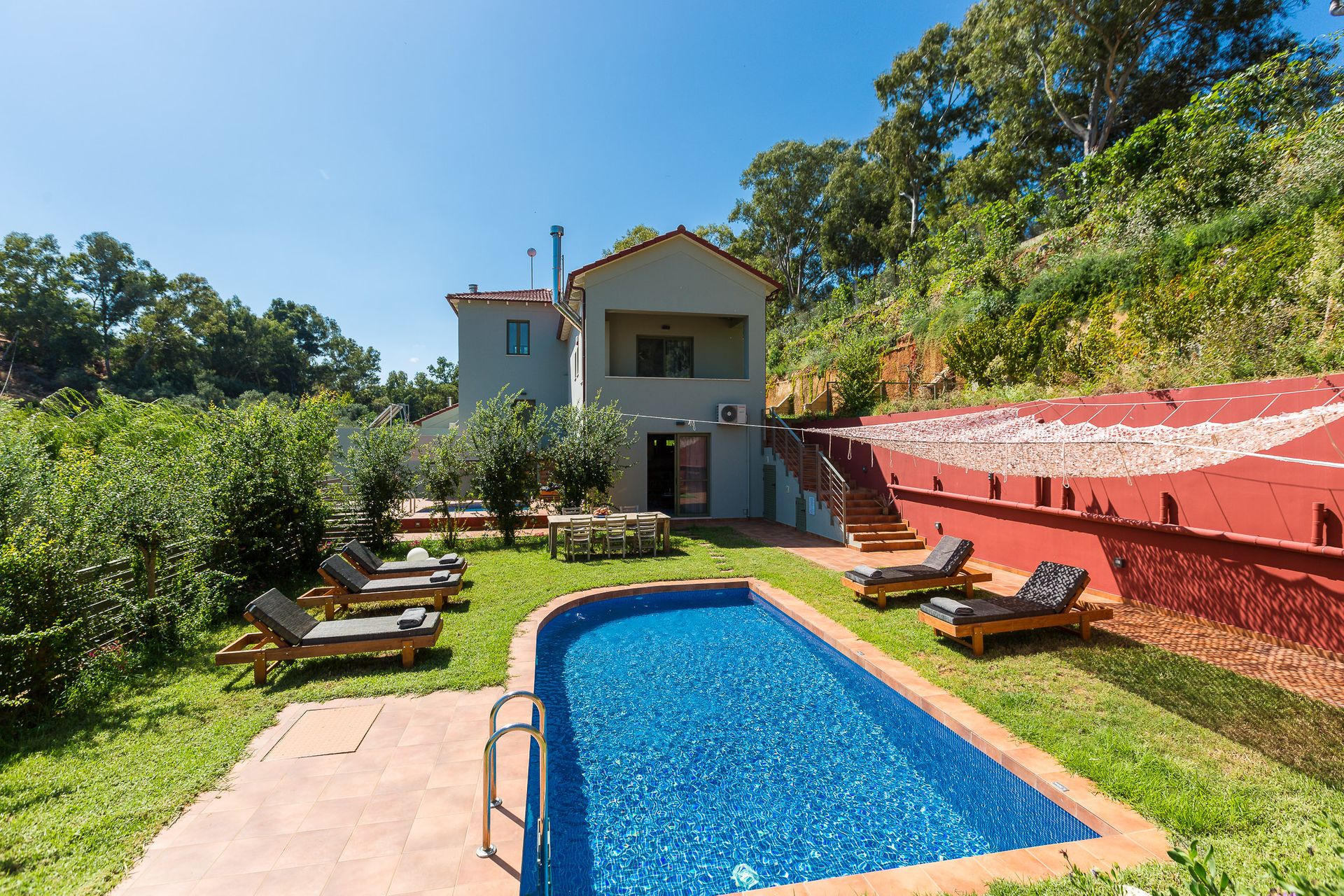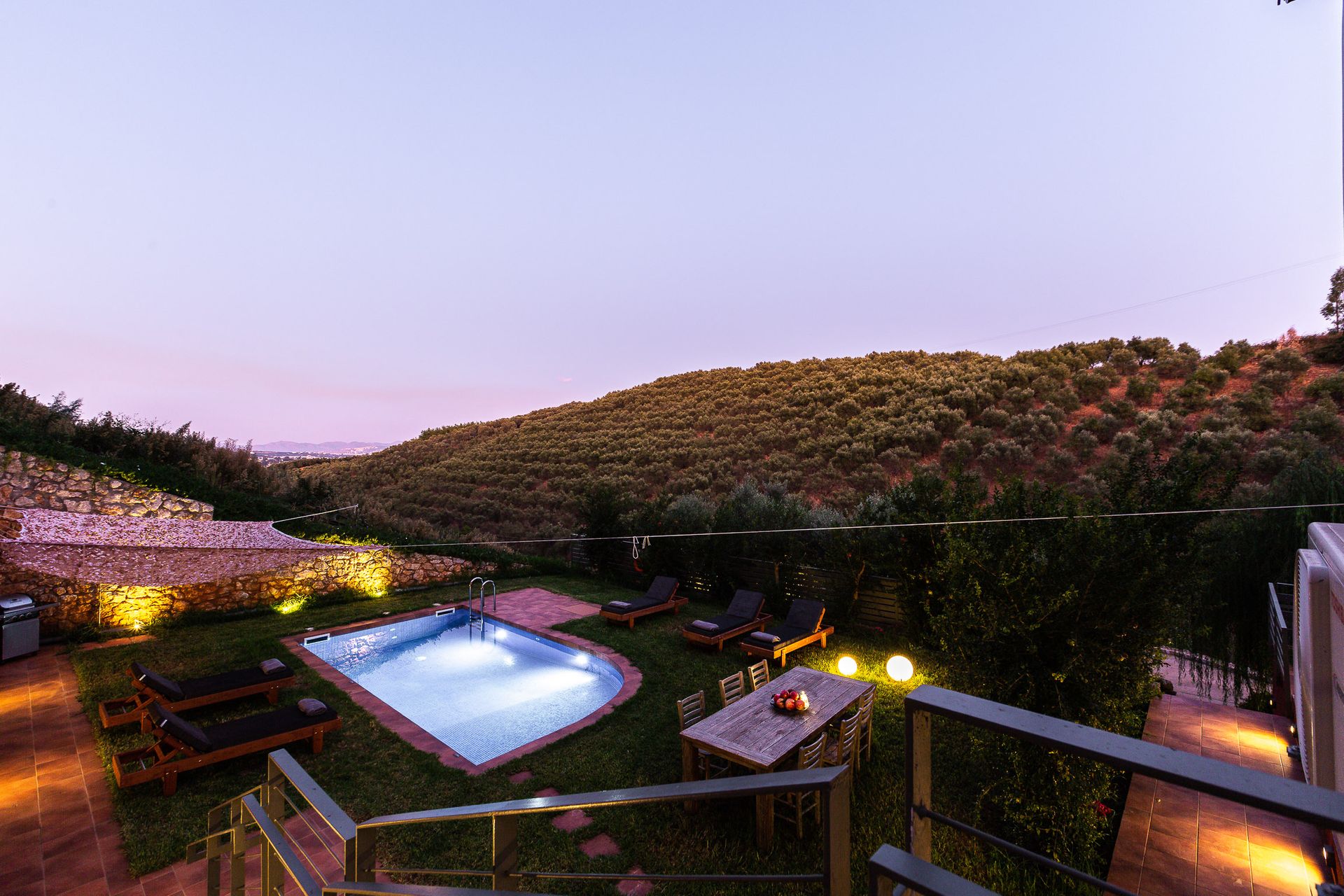 Παροχές: Baby Cot, Bath Amenities, Bathrobes and Slippers, Bathroom with Shower, Bathroom with Steam Cabin, Cable-Satellite TV, Closet, Coffee Facilities, Cutlery, Dining Table, Fireplace, Flat Screen TV, Full-length Mirror, Fully Equipped Kitchenette, Garden, Hairdryer, House Wine and Fruit Basket upon arrival, Individually Controlled Air Condition, Iron & Ironing Board, Living Room, Modern Furnishing, Mountain View, Movie & Sport Channels, Non-smoking villas throughout, Pool towels, Pool View, Private Balcony, Private Terrace, Refrigerator, Room Service, Sofa Bed, Soundproof Windows, WiFi Internet access, Δύο Ιδιωτικές Πισίνες, Φιάλη Κρασιού